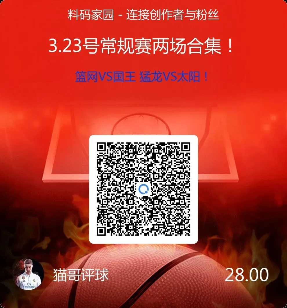 明天比赛不多,直接选择了两场作为合集分享给大家!内附篮网对阵国王 猛龙对阵太阳两场!各位可根据自身需求扫码获取!(内附单场建议)