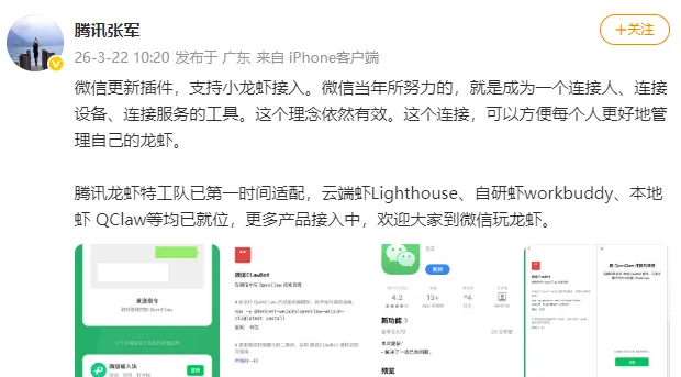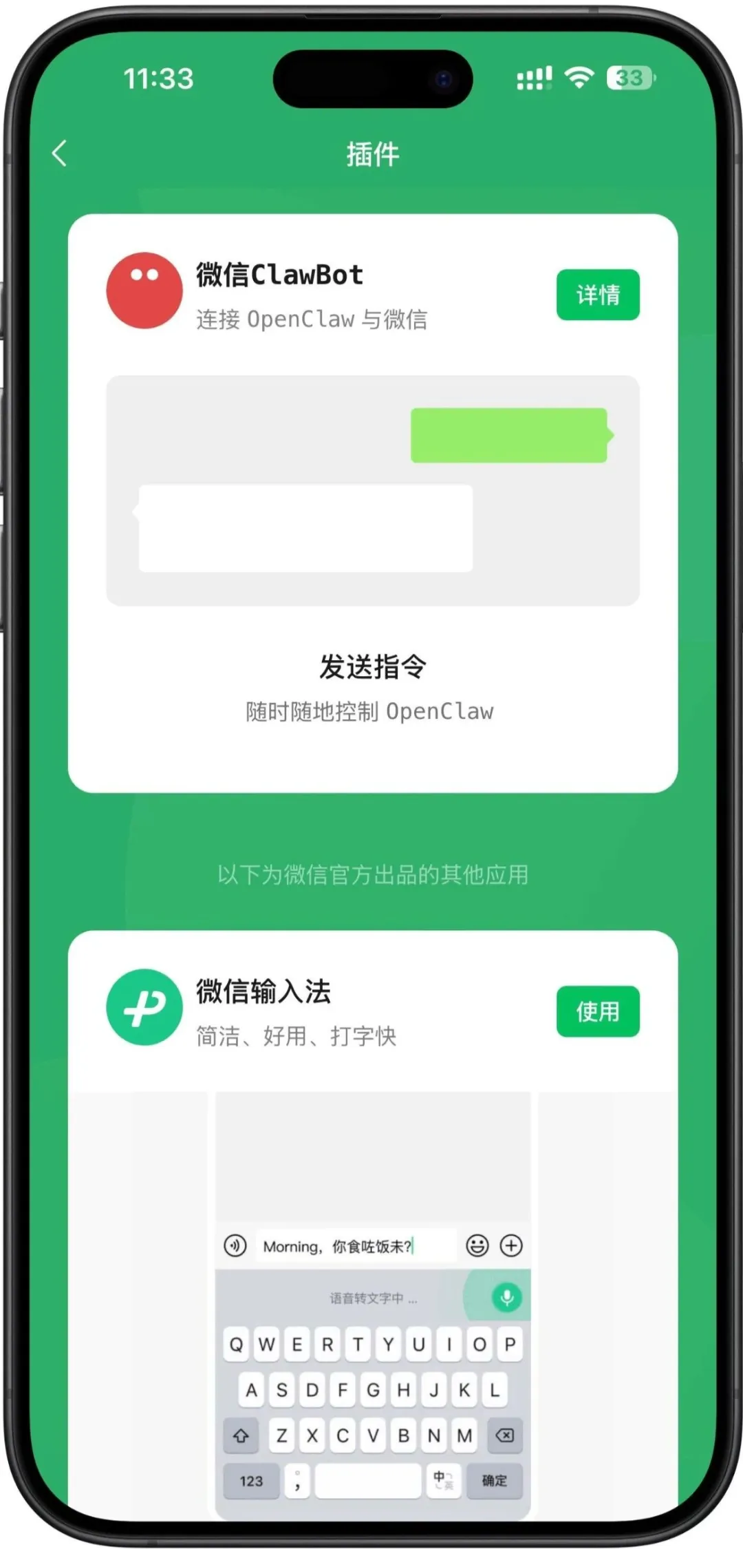 突发!微信龙虾插件上线,两步就能接入! 小伙伴们,大家好!这里是爱疯神器!公众号改版信息流之后很多读者收不到博主发出的文章,建议大家星标公众号! 开启今日之旅 hello,大家好!刚刚发现iOS微信8.0.70版本更新以后,微信官方的ClawBot插件也陆续覆盖上线了,只需两步就能把你的AI助手装进微信。 根据官方描述,微信龙虾插件广泛兼容Lighthouse、Workbuddy、QClaw等各类封装或创建的龙虾,也支持作为消息通道自动化操作。 操作步骤:❶ 打开微信—设置—插件中启用ClawBot(目前iOS端基本覆盖,安卓尚不清楚)❷ 选择扫码绑定OpenClaw账号,添加微信ClawBot,连接成功后可直接在聊天界面给你的龙虾发指令。 目前接入龙虾后仅支持个人单点使用,不支持群聊,也不会自动化操作微信,如果没有找到插件,可尝试更新微信至最新版本。 精彩回顾>>> iOS终身会员!App Store限时0元解锁! 牛X!苹果正式官宣国行重磅功能解禁!