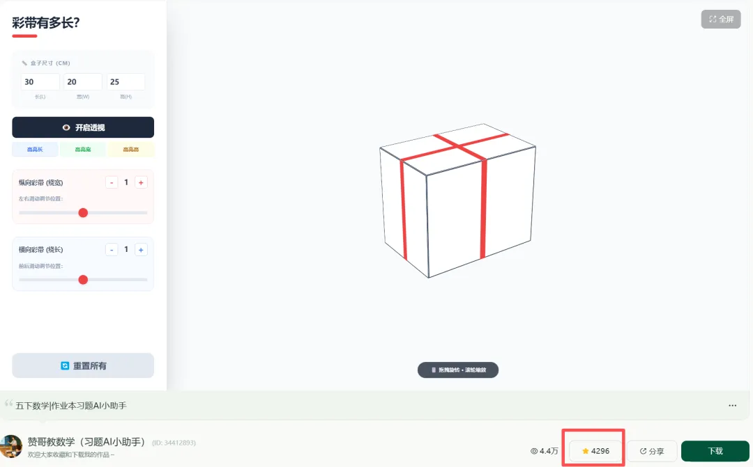 主要原因还是解决了五年级老师们的教学实际问题。AI小助手不仅有一键生成图形功能,还可以点击一键透视,直观看到长方体的内部。