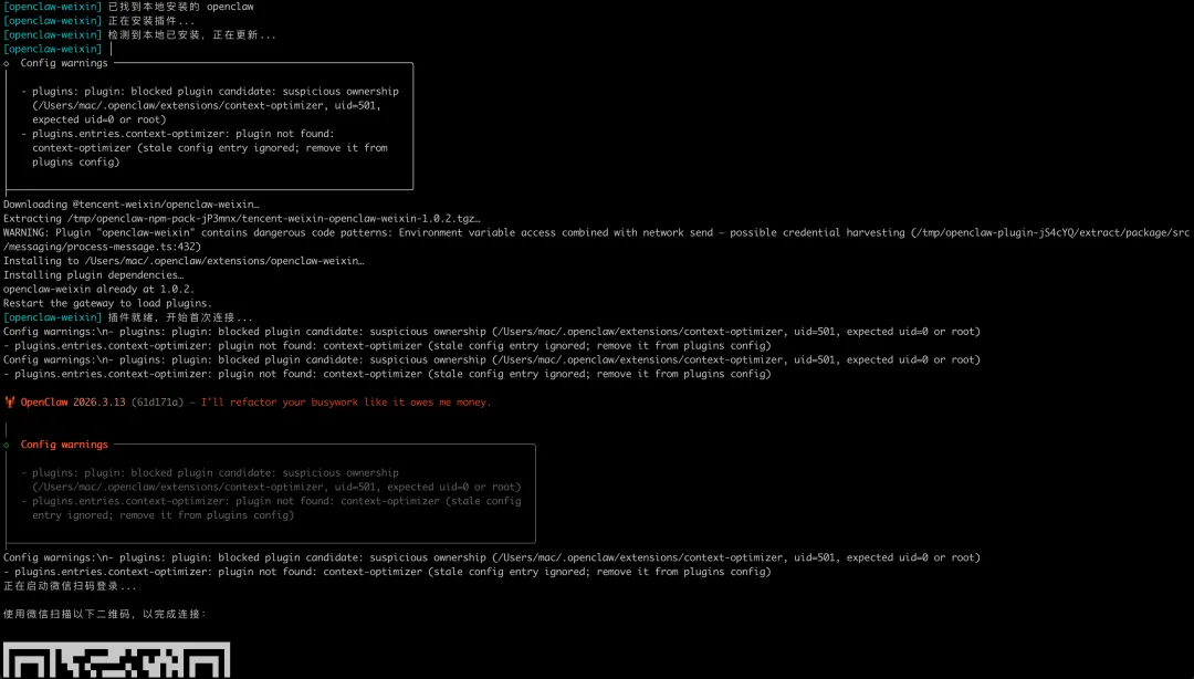 在电脑终端执行以下命令,完成安装并生成关键二维码: