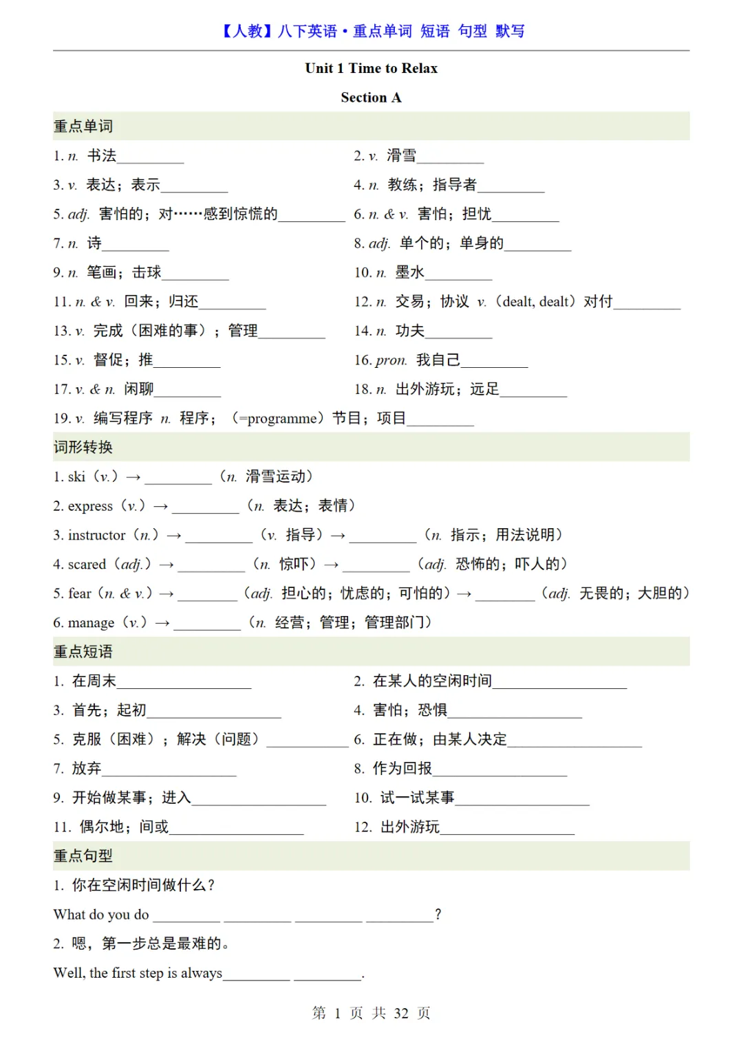 【资源免费下载】八年级(下)英语 26春重点单词短语句型默写《人教版》,PDF电子版,可打印