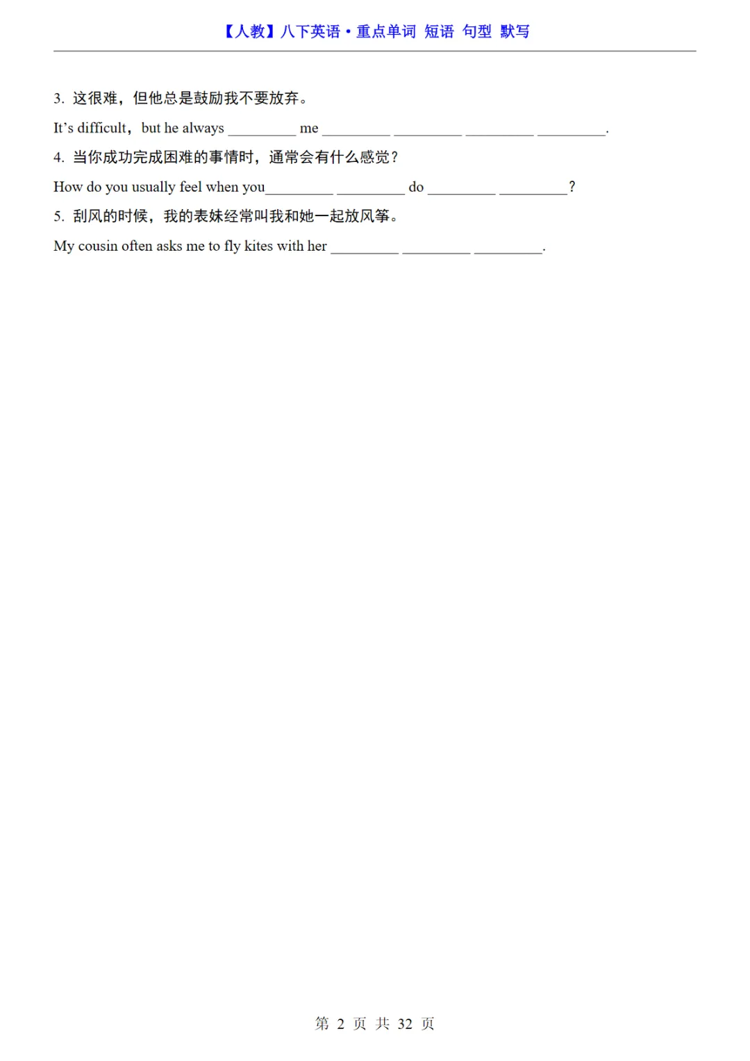 八年级(下)英语 26春重点单词短语句型默写《人教版》