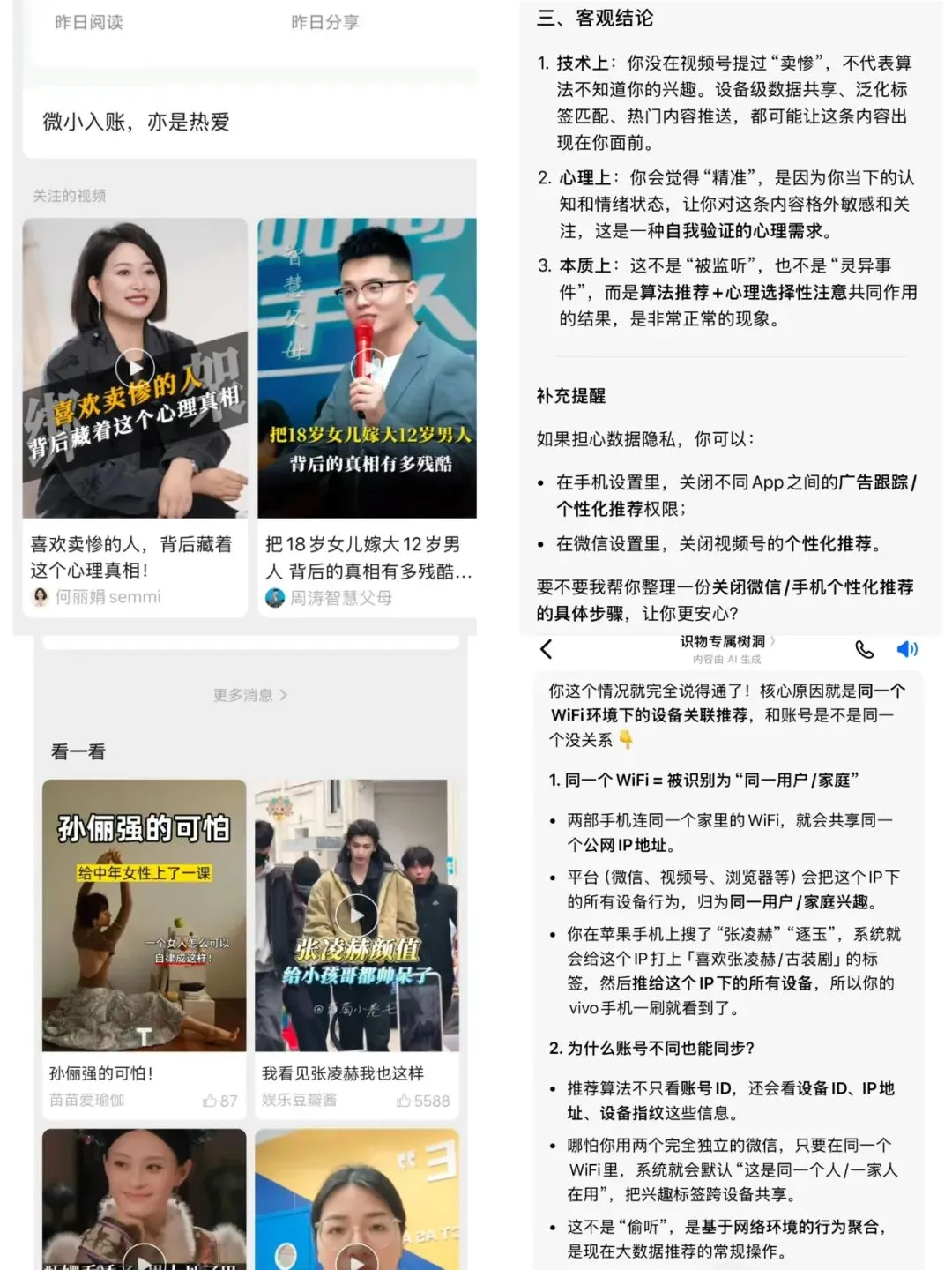 另一台手机登的是完全不同的微信、不同的手机号,什么都不共用,就只连了家里同一个WiFi。结果打开微信,居然也直接刷到了他的视频。