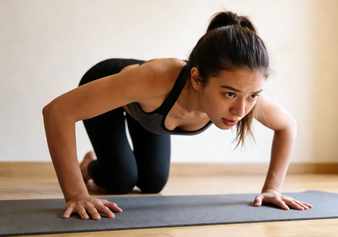 1.跪姿俯卧撑:膝盖着地,双手撑地(与肩同宽),屈肘向下(胸部靠近地面),每组10次(新手可降低难度,手肘不用完全弯曲);