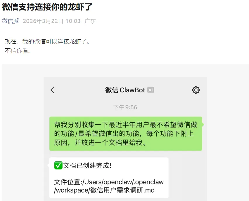 微信推出官方龙虾插件:连接后,用户就能通过微信聊天的方式,快速调用自己的“龙虾”高效互动