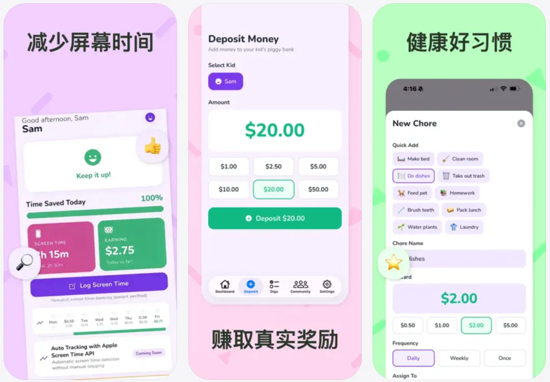 家长能给娃设每日 / 每周的控屏目标,还能跟踪娃的离线活动进度,少玩手机还能赚零花钱,娃的积极性直接拉满,还能帮着建立健康作息和责任感~