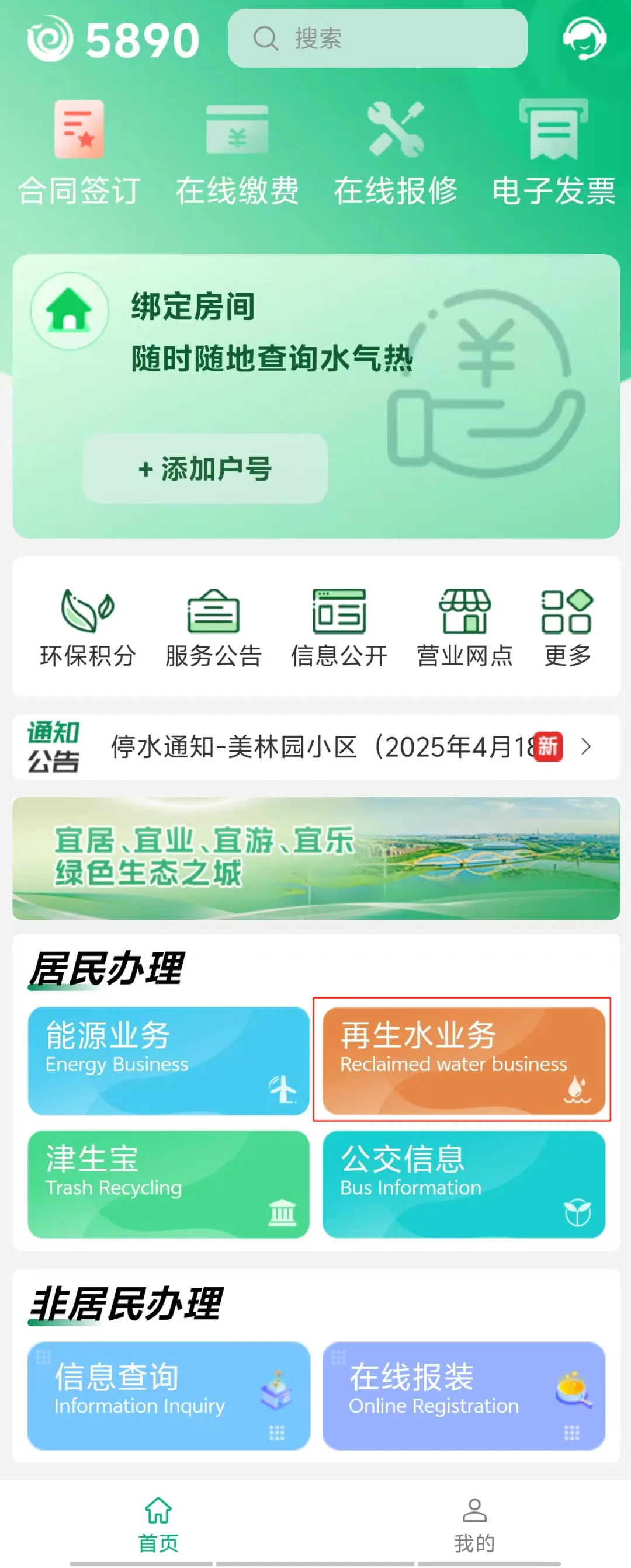 1.扫描下方二维码,下载并登录“5890”APP(如没有账号,请先注册并绑定房间)-点击首页“居民办理”→“再生水业务”。