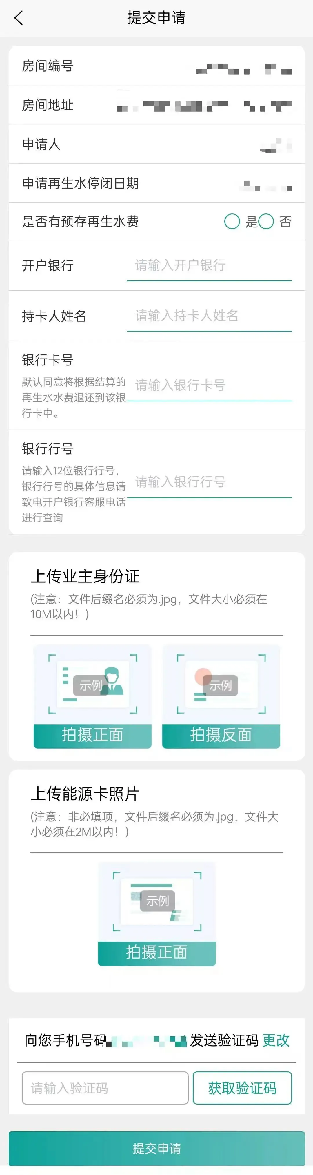 4.填写“开户银行”“持卡人姓名”“银行卡号”和“银行行号”,上传“业主身份证”和“能源卡照片”,填写联系电话以及验证码。