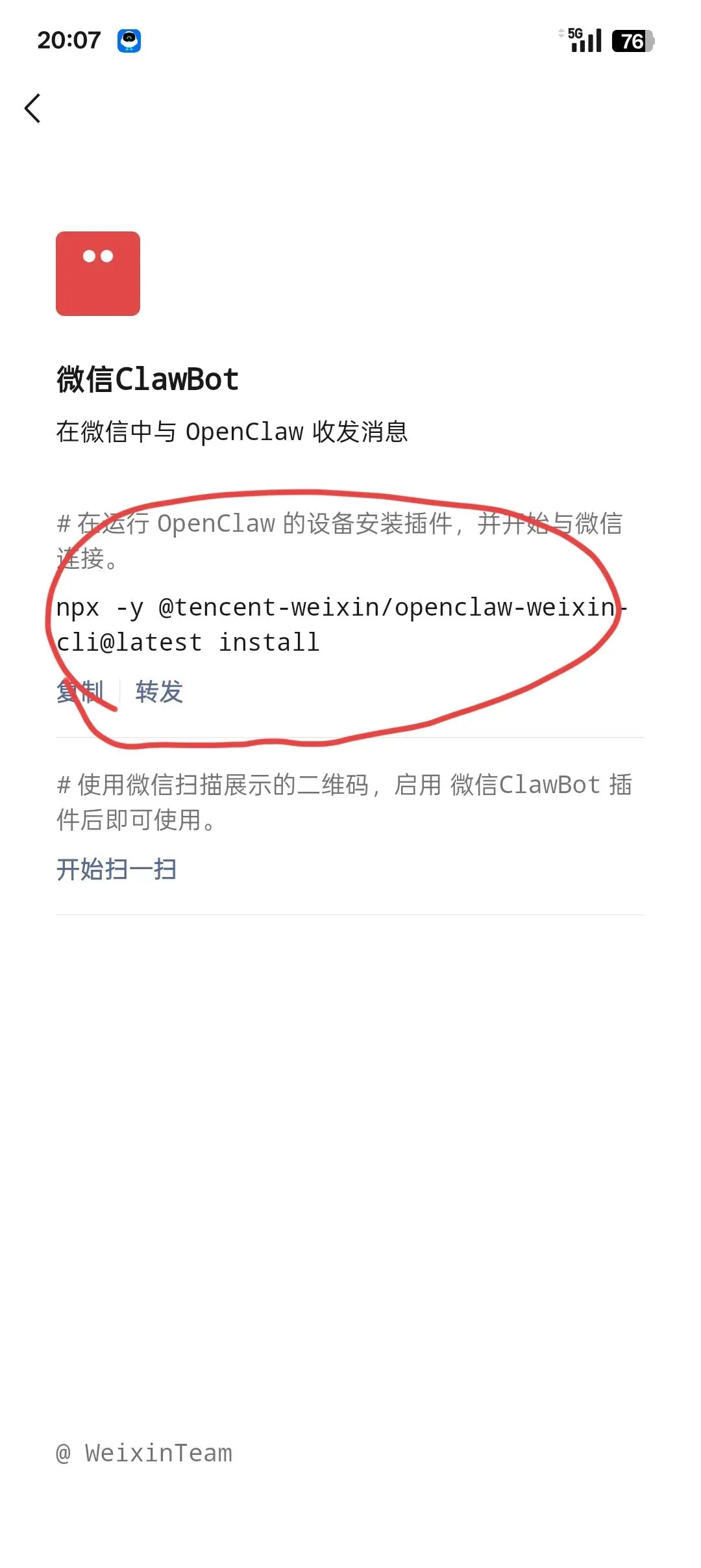 npx -y @tencent-weixin/openclaw-weixin-cli@latest install
