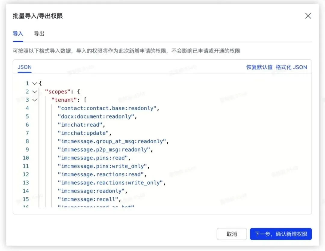 {"scopes":{"tenant":["contact:contact.base:readonly","docx:document:readonly","im:chat:read","im:chat:update","im:message.group_at_msg:readonly","im:message.p2p_msg:readonly","im:message.pins:read","im:message.pins:write_only","im:message.reactions:read","im:message.reactions:write_only","im:message:readonly","im:message:recall","im:message:send_as_bot","im:message:send_multi_users","im:message:send_sys_msg","im:message:update","im:resource","application:application:self_manage","cardkit:card:write","cardkit:card:read","contact:user.basic_profile:readonly"],"user":["contact:user.employee_id:readonly","offline_access","base:app:copy","base:field:create","base:field:delete","base:field:read","base:field:update","base:record:create","base:record:delete","base:record:retrieve","base:record:update","base:table:create","base:table:delete","base:table:read","base:table:update","base:view:read","base:view:write_only","base:app:create","base:app:update","base:app:read","sheets:spreadsheet.meta:read","sheets:spreadsheet:read","sheets:spreadsheet:create","sheets:spreadsheet:write_only","docs:document:export","docs:document.media:upload","board:whiteboard:node:create","board:whiteboard:node:read","calendar:calendar:read","calendar:calendar.event:create","calendar:calendar.event:delete","calendar:calendar.event:read","calendar:calendar.event:reply","calendar:calendar.event:update","calendar:calendar.free_busy:read","contact:contact.base:readonly","contact:user.base:readonly","contact:user:search","docs:document.comment:create","docs:document.comment:read","docs:document.comment:update","docs:document.media:download","docs:document:copy","docx:document:create","docx:document:readonly","docx:document:write_only","drive:drive.metadata:readonly","drive:file:download","drive:file:upload","im:chat.members:read","im:chat:read","im:message","im:message.group_msg:get_as_user","im:message.p2p_msg:get_as_user","im:message:readonly","search:docs:read","search:message","space:document:delete","space:document:move","space:document:retrieve","task:comment:read","task:comment:write","task:task:read","task:task:write","task:task:writeonly","task:tasklist:read","task:tasklist:write","wiki:node:copy","wiki:node:create","wiki:node:move","wiki:node:read","wiki:node:retrieve","wiki:space:read","wiki:space:retrieve","wiki:space:write_only","contact:user.basic_profile:readonly"]}}