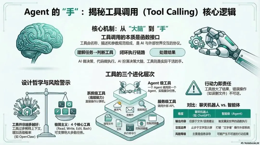 Agent之所以能”做事”而不只是”说话”,是因为工具调用打破了语言模型只能输出文字的结构性限制——AI是判断和决策的大脑,工具是真正执行的手,两者缺一不可,而工具越多越好的直觉是错的,克制的工具设计才能让Agent真正好用,代价是工具赋予了行动力、也带来了不可逆的风险。
