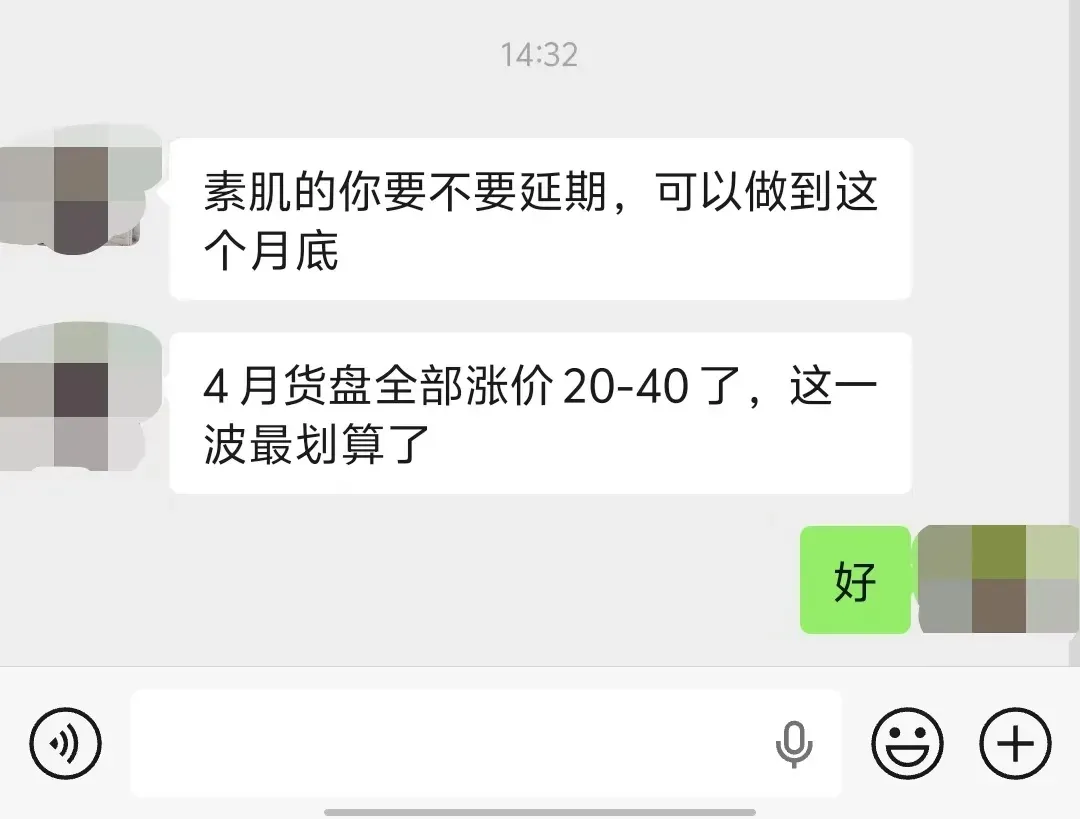 最重要的是:4月份素肌内衣全面涨价,统一涨20-40。不是搞什么营销套路哈,是真的涨,大家看我们和上游的聊天记录: