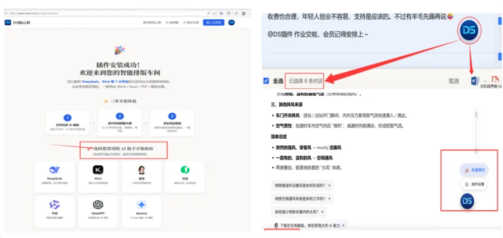 终于找到了一款能一次导出AI对话内容的工具——“DS随心转”