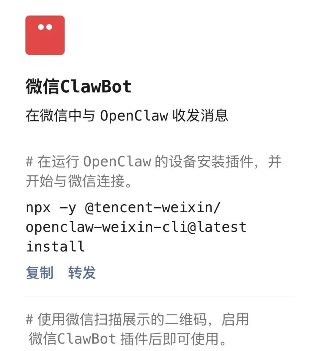 🦞 「微信 ClawBot」 支持接入 OpenClaw(「龙虾」)AI 助手,用户扫码或复制指令即可完成连接,此后便能直接在微信聊天界面与自己的「龙虾」高效互动。