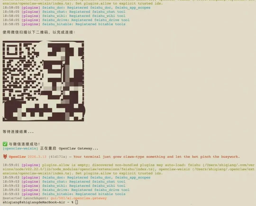 在你的电脑上执行以上命令,按照命令指引扫描二维码,将微信完成账号绑定。
