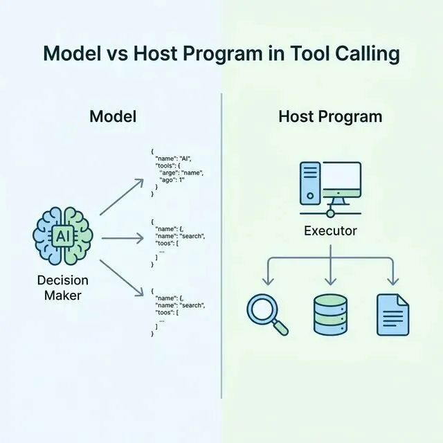 模型不执行工具,它只输出调用请求。真正执行的是宿主程序。工具调用是一个闭环:判断→请求→执行→回传→继续推理。工具调不好,大多不是模型的问题,而是 Schema 没写好。Function Calling 和 Tool Calling 本质一样,后者是前者的演进。