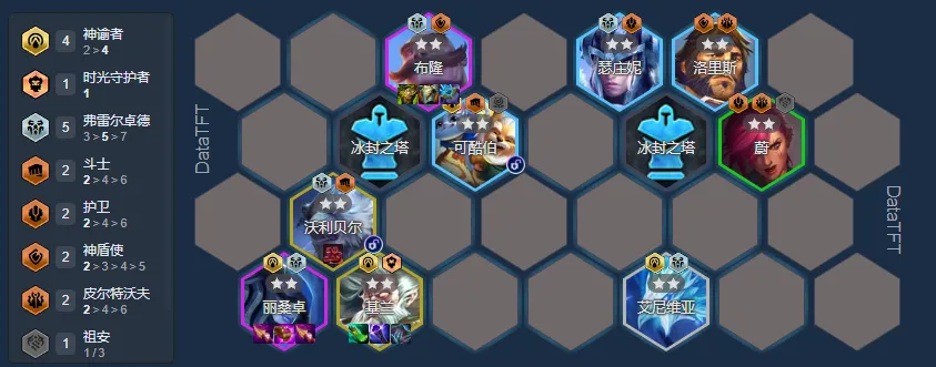 开局随机到时光有两套阵容可以选择,一是德玛拉克丝+时光,二是这套神谕冰女;时光这两个版本都在加强其技能伤害,且其独特的机制也使他在五费卡中是独一档的存在;前期开局有赛恩就直接解锁妖姬,利用神谕+斗士进行过渡期间可以小D质量,为了解锁可酷伯,中期上斗士或者是神谕者凑4斗士或者4神谕者,利用3诺克和2星妖姬和2星前排过渡,4阶段时光登场后下掉妖姬开5弗雷(寒冰代替狗熊位置)+4神谕,利用两星布隆+狂徒解锁狗熊组成标准阵容,后续上9可以将2皮城换成其他强力5费单卡;