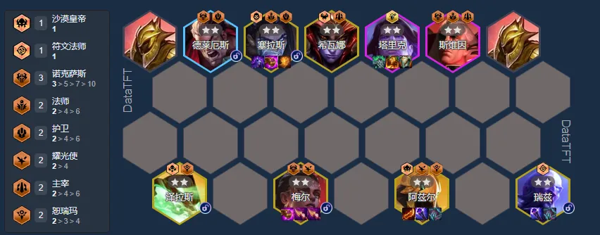 3诺克萨斯2法师2护卫2耀光使2主宰2恕瑞玛1符文法师阵容码:0202536b01235d01f336019359013000TFTSet16