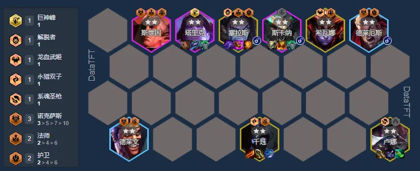 千珏首推当然是诺克九五,毕竟算是物理阵容为数不多的荣光体系了;前期野怪有爆出德莱文那就是天胡开局,利用德莱文往诺克体系去走再配合一个经济海克斯可以在前中期建立起优势,而来到4阶段德莱文装备完美衔接给千珏,利用经济优势直接拉9,将阵容替换成体系卡;