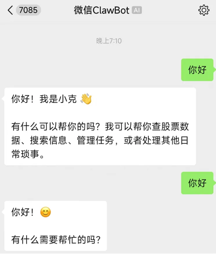 3. 绑定成功后,你的微信消息列表里就会出现一个专属的“ClawBot”对话框。现在,试着给它发一句“你好”,开始高效互动吧!