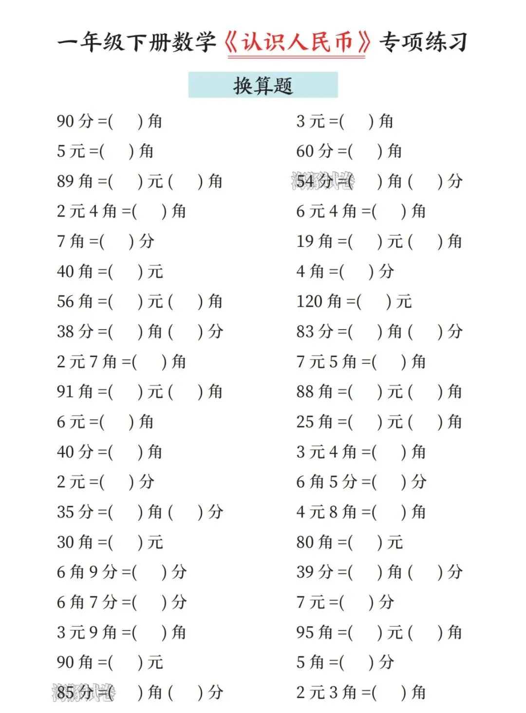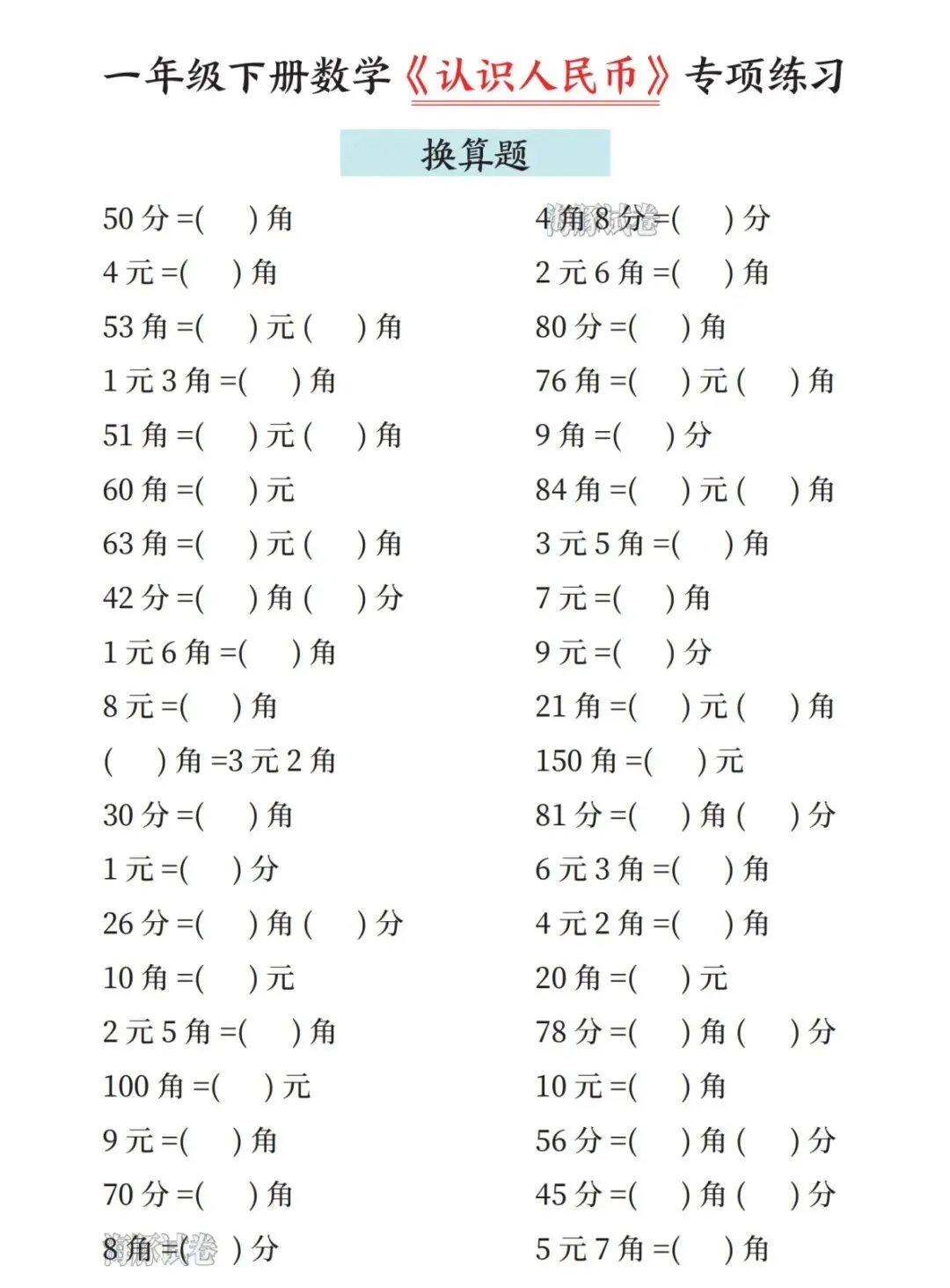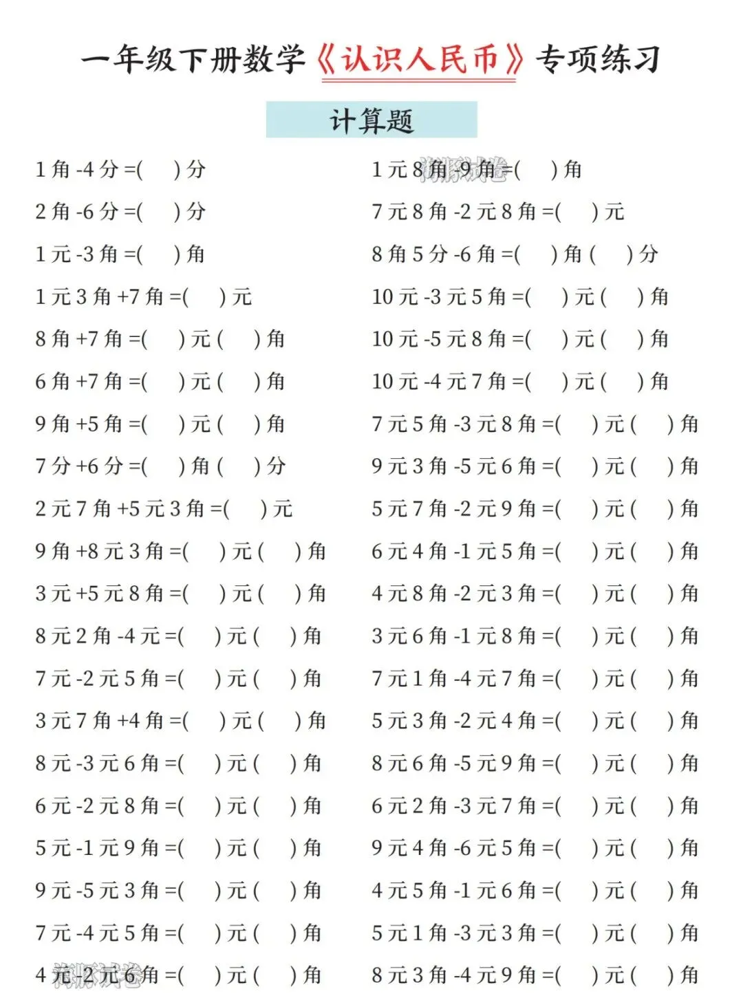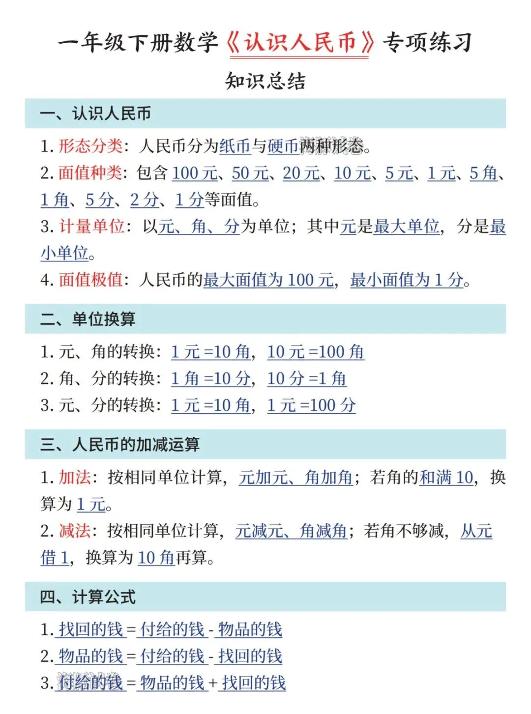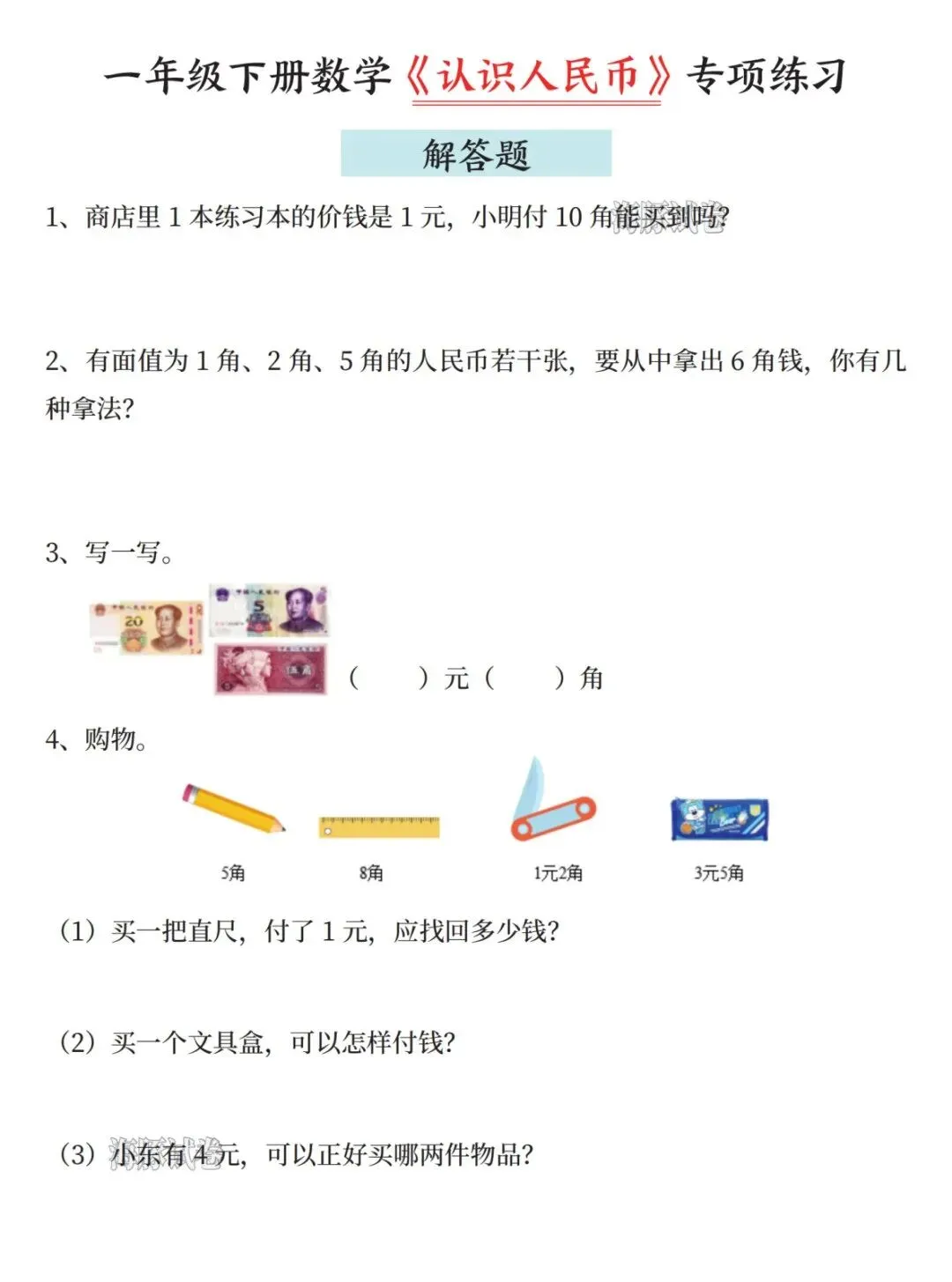 本期给大家整理的是26年一年级数学下册【认识人民币】,电子版可打印,需要的家长可以打印给孩子练习巩固。