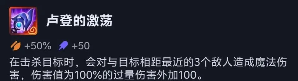 卢登的激荡这件神器深受法师棋子们的喜爱,因为参与击杀可以触发神器属性。对目标最近的3个敌人造成魔法伤害,伤害值还是100%的过量伤害额外加100。也就是我一个技能能攻击1000血对面只有100血条,我们剩下的输出会通过弹射3个黑球反馈到敌人身上。