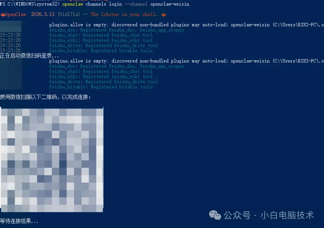 就是先在部署好OpenClaw的电脑上安装好微信ClawBot插件,然后让它展示二维码。