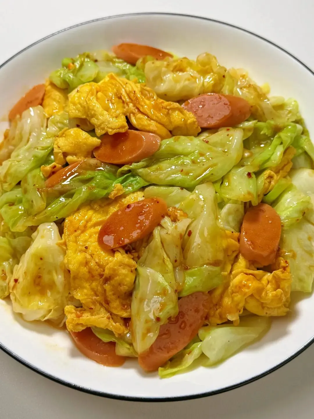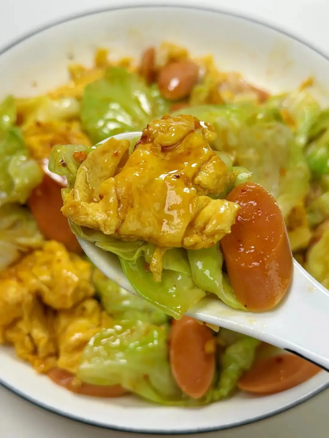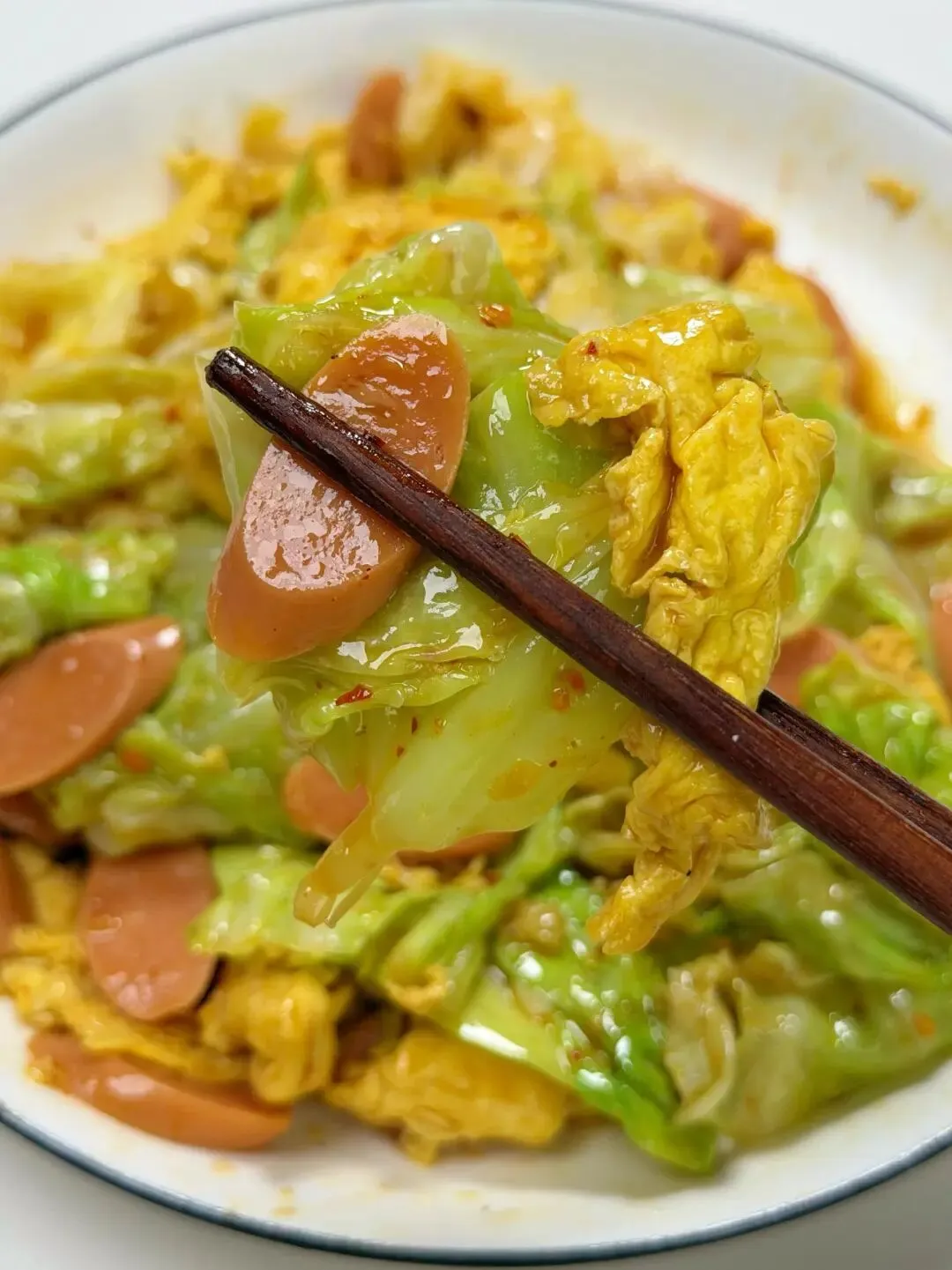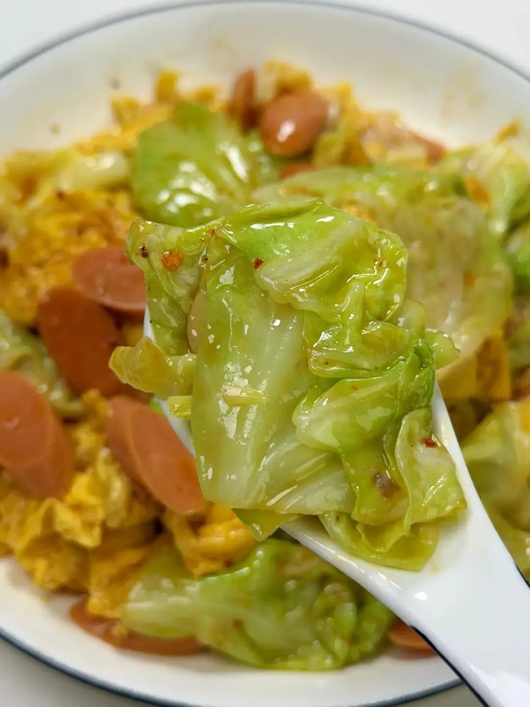 – 小贴士:包菜选紧实脆嫩的,火腿肠用淀粉少的更香,不吃辣可以把辣椒面换成少许白胡椒~