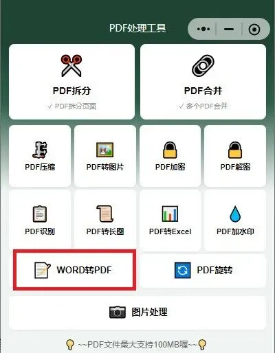 底部那句温馨提示“PDF文件最大支持100MB喔”同样适用——不过Word转PDF后体积通常会变小,所以完全不用担心。