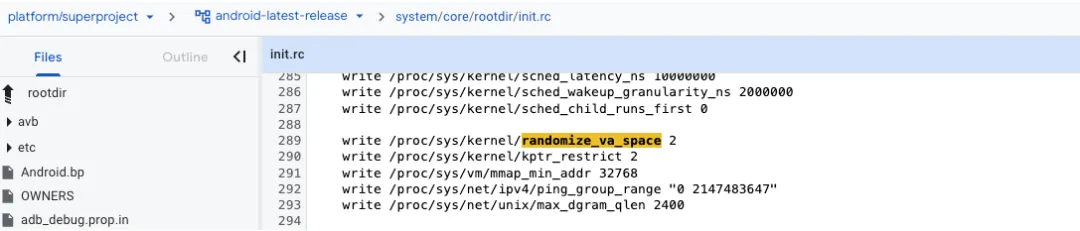 因此,我们必须在 Init 进程启动的过程中将 randomize_va_space 改回来。