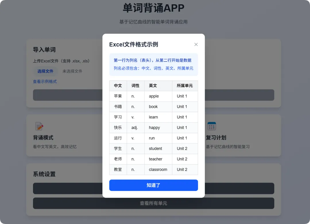 可以从Excel导入单词表,单词表大家可以通过AI工具比如豆包去进行单词整理。