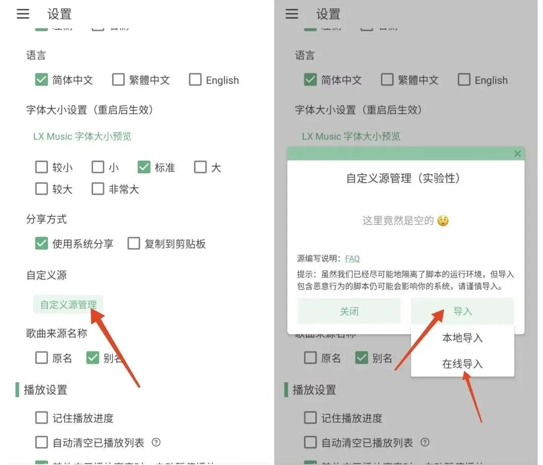 01、首先先将软件本体与小鹿提供的音源下载到本地。之后打开软件的【设置】,找到【自定义源管理】选项。点击【本地导入】