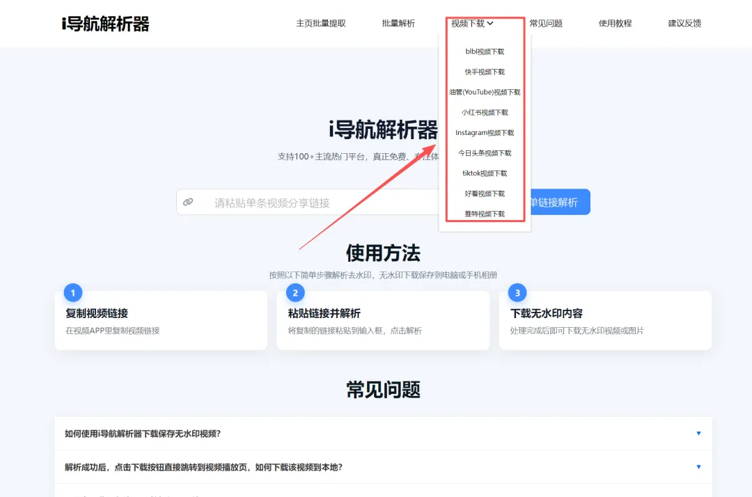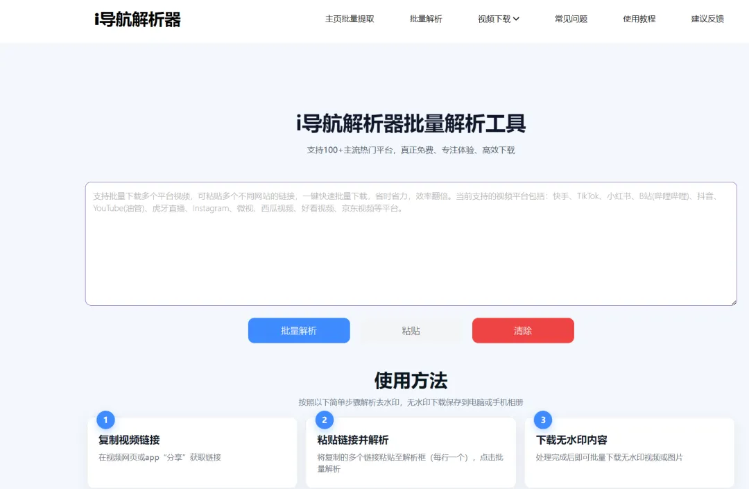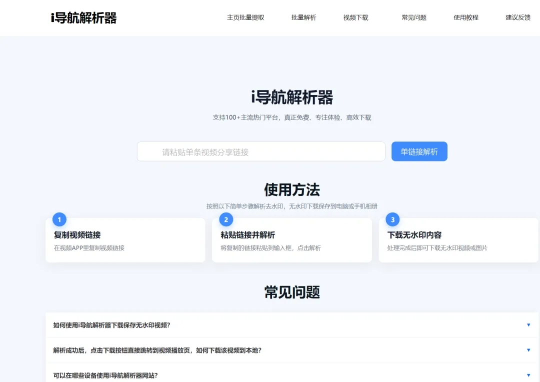 i导航解析器是一个视频与图片无水印下载的在线服务平台,免费使用,支持下载解析抖音,快手,b站(哔哩哔哩),油管(YouTube)等上百个平台的视频,并自动去除视频水印