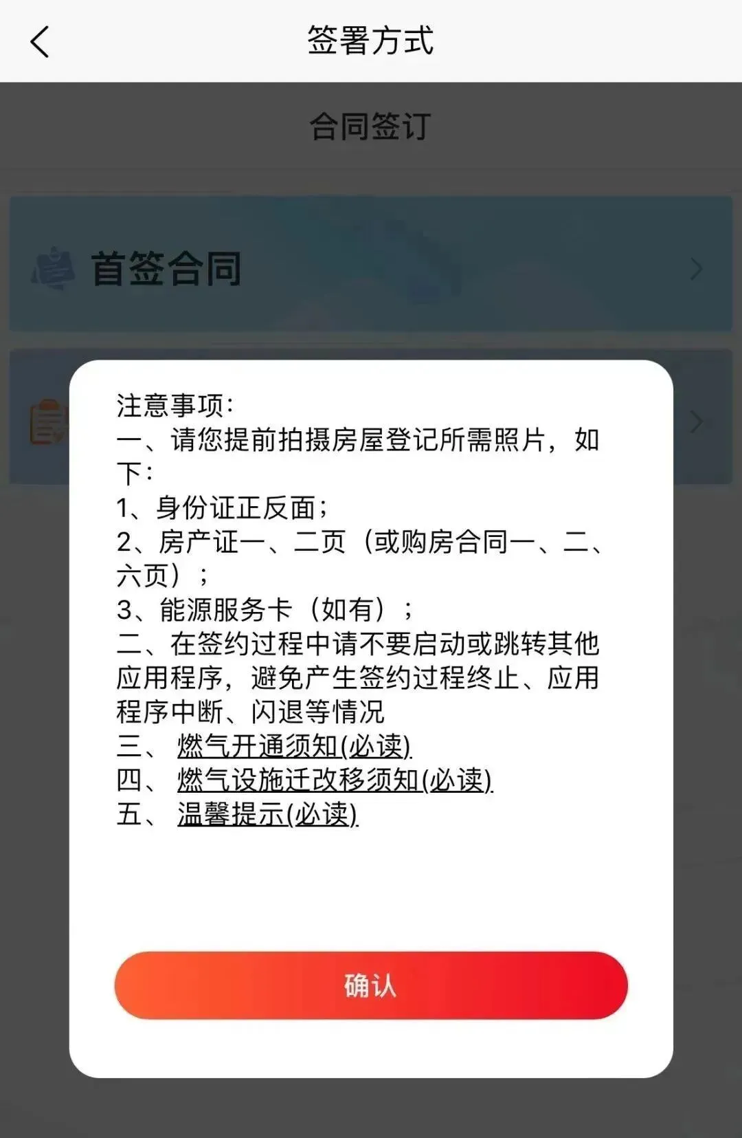4、请先阅读“注意事项”,准备好相关材料,继续阅读三个必读项后点击“确认”进入“房屋登记”页面,按提示操作完成即可。