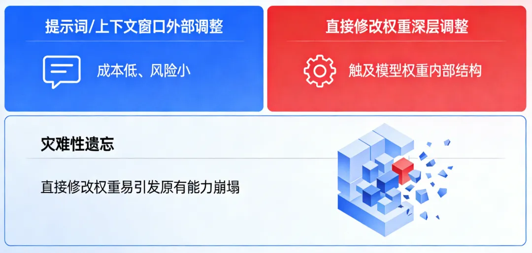 当前主流做法仍是通过提示词(prompt)或上下文窗口进行外部调整,这种方式成本低、风险小,但无法触及模型权重内部的深层结构。