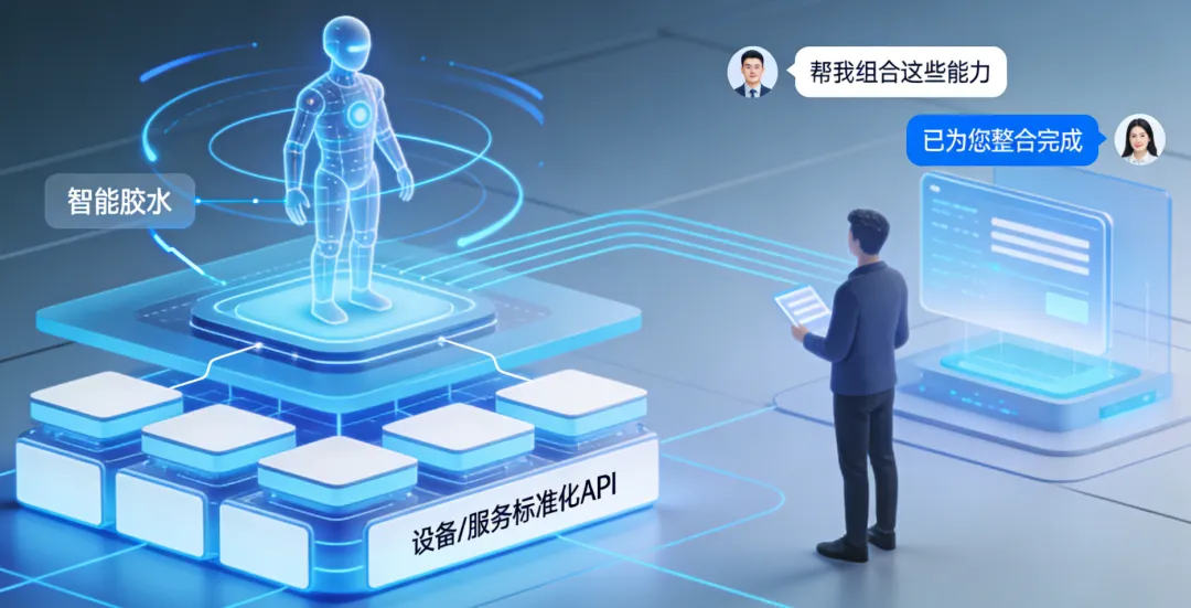 底层是设备/服务提供的标准化API,上层是由Agent作为“智能胶水”动态组合这些能力。