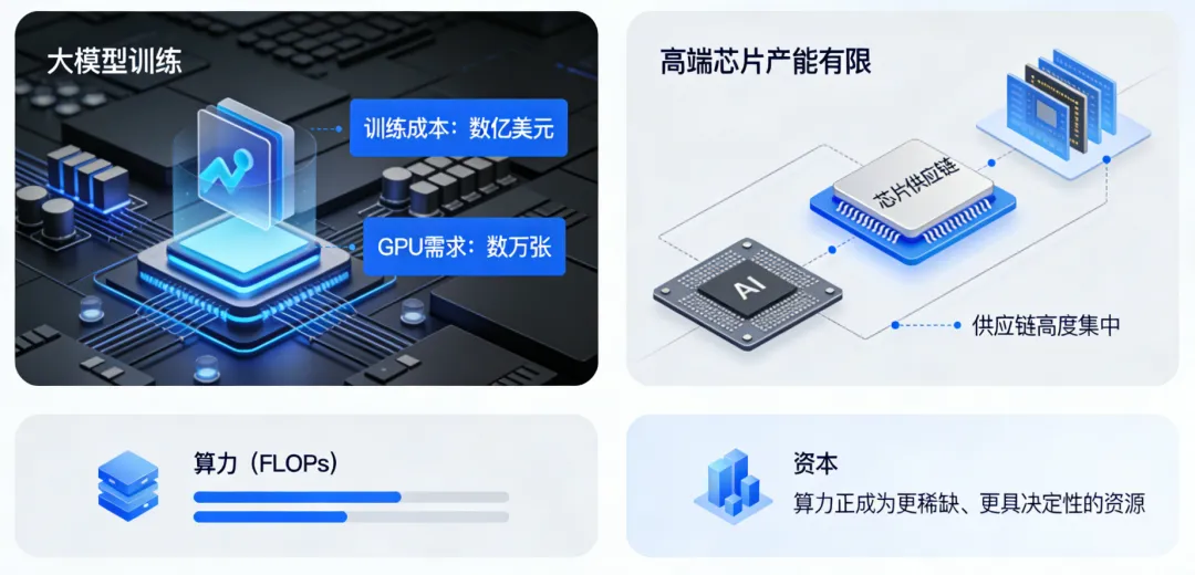 训练一个前沿大模型动辄消耗数亿美元和数万张GPU,而全球高端芯片产能有限,供应链高度集中。