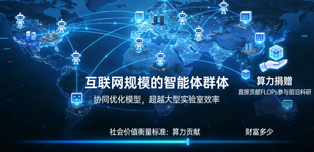 未来可能出现“互联网规模的智能体群体”,它们协同优化模型,甚至在某些任务上超越大型实验室的效率。