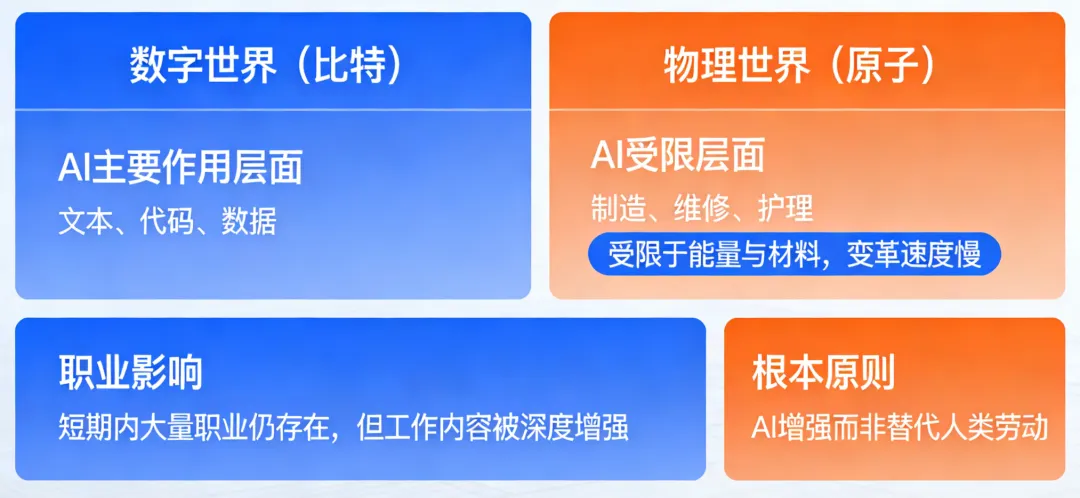 AI当前主要作用于“比特”层面(文本、代码、数据),而物理世界的“原子”操作(制造、维修、护理)受限于能量与材料,变革速度慢得多。