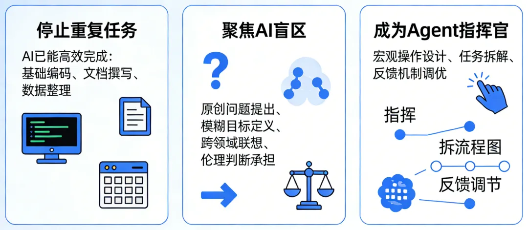 停止重复AI已能高效完成的任务(如基础编码、文档撰写、数据整理);