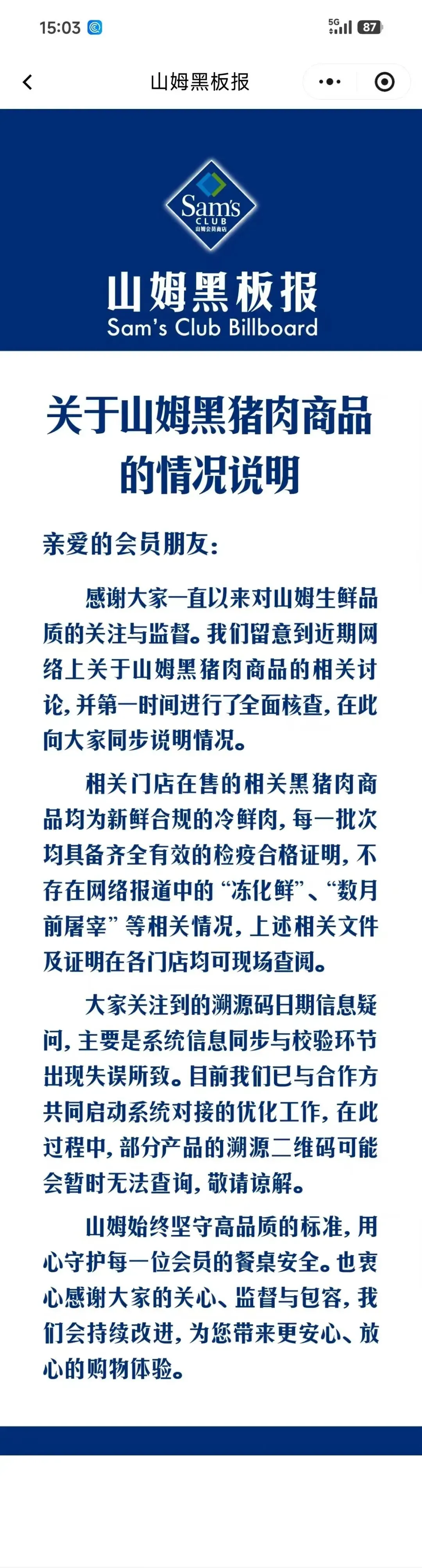 感谢大家一直以来对山姆生鲜品质的关注与监督。我们留意到近期网络上关于山姆黑猪肉商品的相关讨论,并第一时间进行了全面核查,在此向大家同步说明情况。