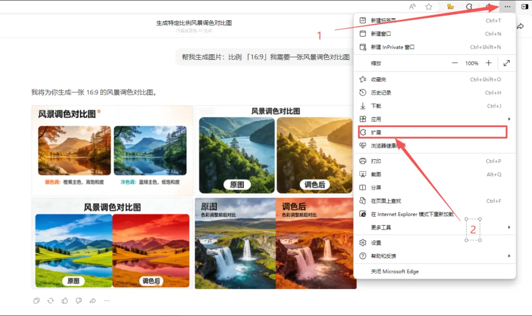 打开 Edge 浏览器,点击右上角“···”,依次选择“扩展”→“管理扩展”。