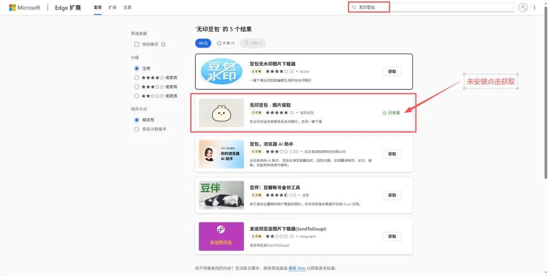 在扩展商店的搜索框内输入 无印豆包,找到对应插件后,点击“获取”并完成安装。