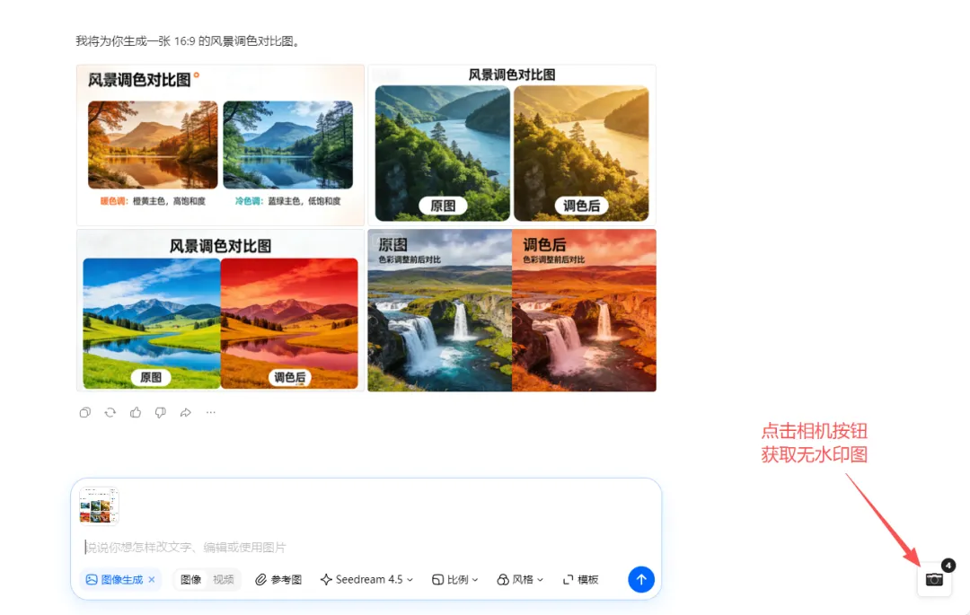 正常使用豆包生成图片后,屏幕右下角会出现一个 摄像头图标,点击它即可下载不带水印的原始图像。