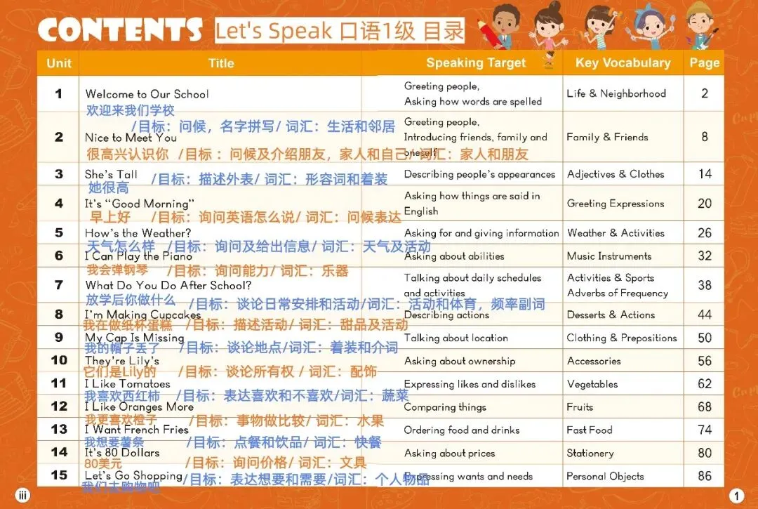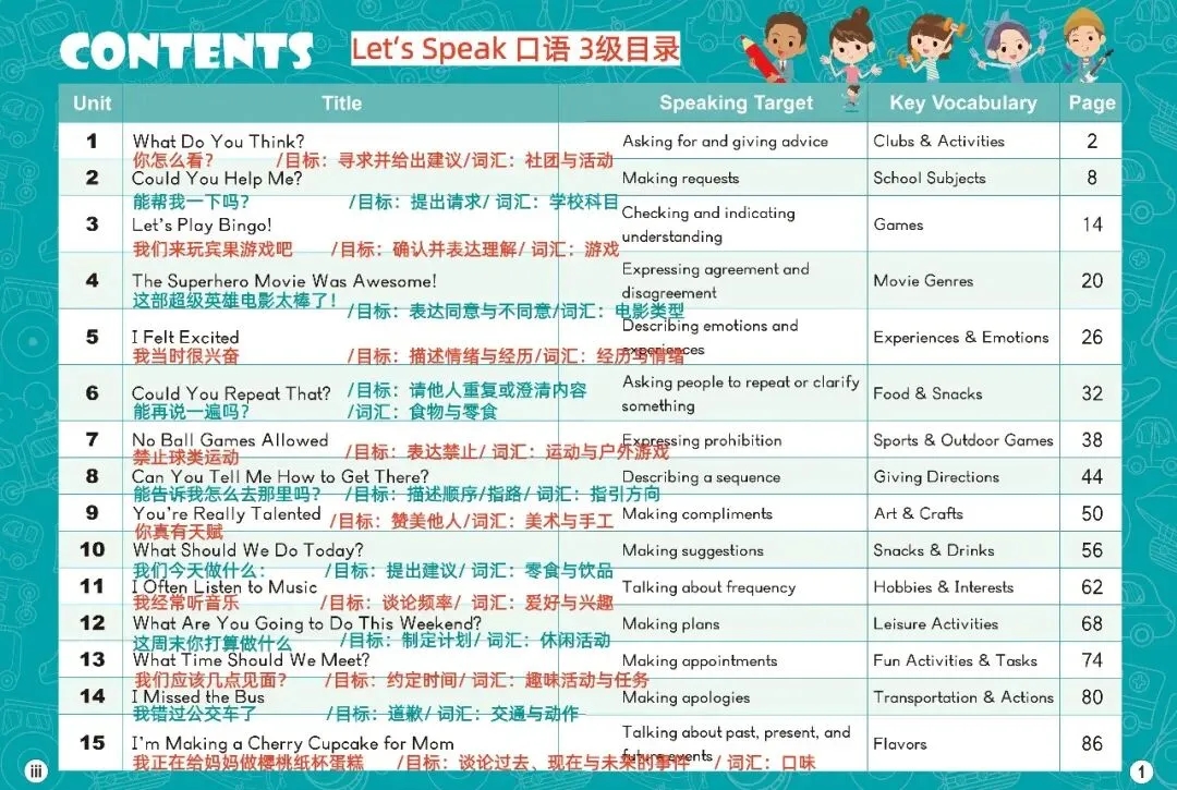 【Let’s Speak!】口语专项教材,注重情境对话设计、贴近生活实际、强调口语互动,在真实场景中学表达!希望这种教学理念与您契合!希望我们的孩子们能够流利地开口说英语。