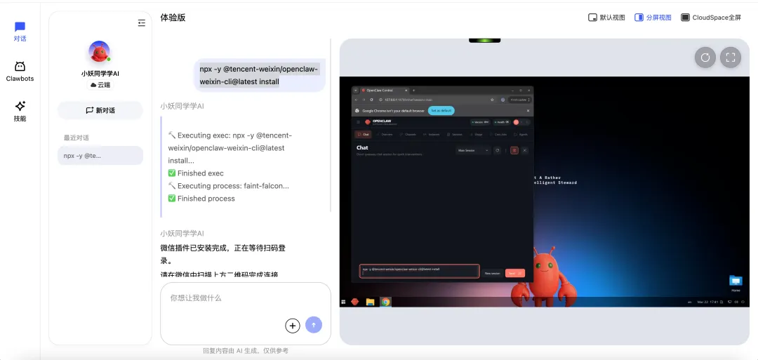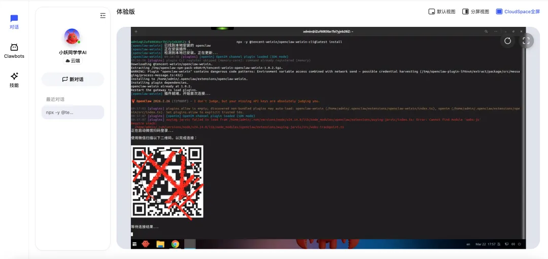 npx -y @tencent-weixin/openclaw-weixin-cli@latest installJVSClaw最牛的地方竟然给出了龙虾的可视化界面!