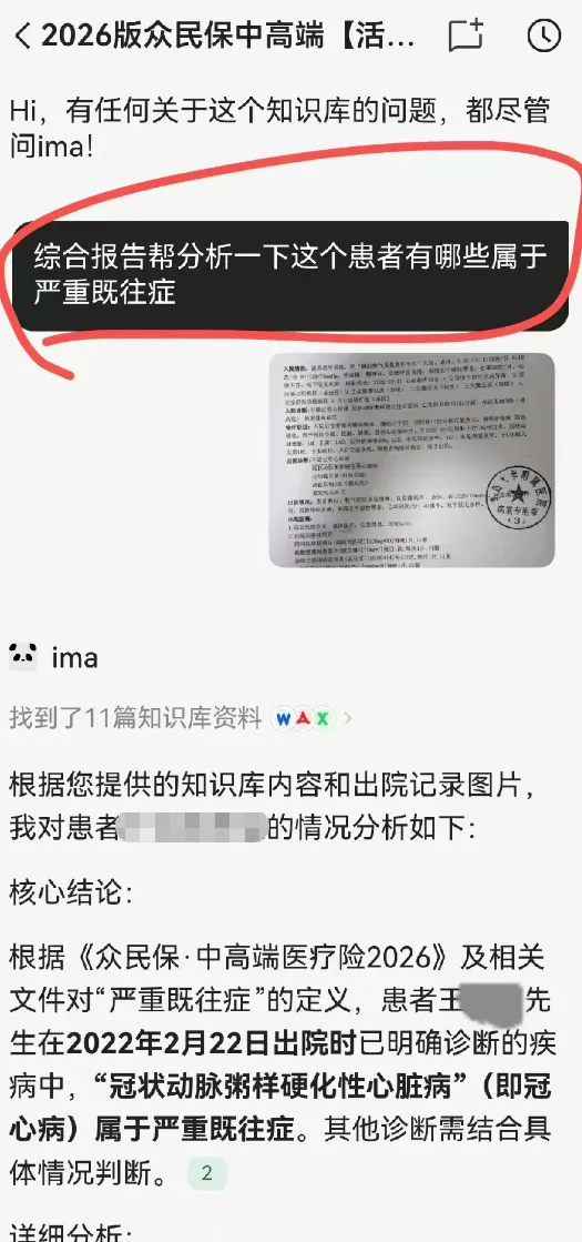 知识库自动返回客户健康情况及众民保对应“严重既往症”部分,给到对应的结论。