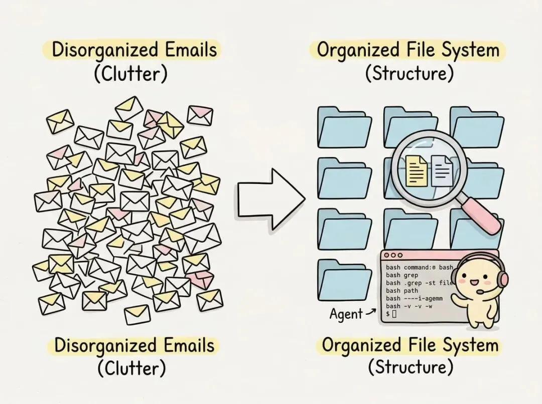 很多人的第一反应是把所有相关邮件都塞进上下文窗口,让模型从 100 封邮件里找答案。这听起来很合理,毕竟上下文窗口越来越大了,为什么不直接用?但其实这跟人类的工作方式完全相反。