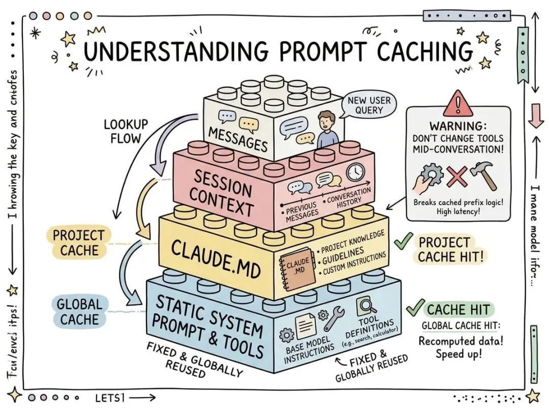 团队最初犯过很多错。比如在系统提示词里放了详细时间戳,每次请求时间都不一样,缓存全部失效。比如工具定义的顺序是随机的,每次排列不同,又是缓存失效。后来他们学会了一个顺序:静态系统提示词和工具放最前面(全局缓存),然后是项目配置(项目内缓存),再是会话上下文(会话内缓存),最后才是对话消息。这样大部分会话都能共享前面的缓存。