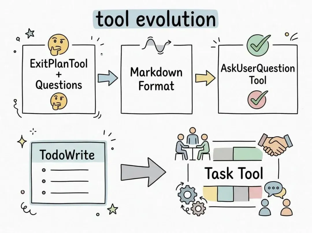 所以他们把 TodoWrite 换成了 Task Tool。Tasks 可以有依赖关系,可以跨 Agent 同步,模型可以随时修改和删除。这不是简单的功能升级,而是从“帮模型记事”变成了“帮模型协作”。